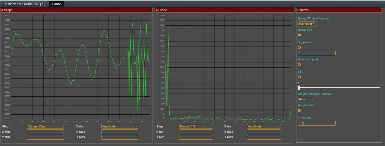 - You will see a change in frequency in the raw data (left A-Scope). In the range FFT, we see the that the peak of the object moves to the right and the amplitude gets weaker.