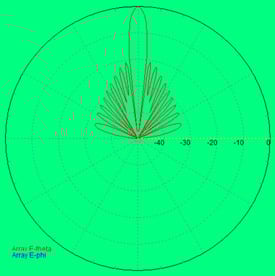 Figure 19. This is the antenna pattern of a linear array antenna of 10 linear elements spaced 1/2 wavelength apart for an X-Band radar. This antenna has no windowing (weighting) of the power distribution to the radiating elements. The LEFT plot is the polar plot representation of the antenna pattern. The RIGHT plot is the antenna pattern in Cartesian coordinates.